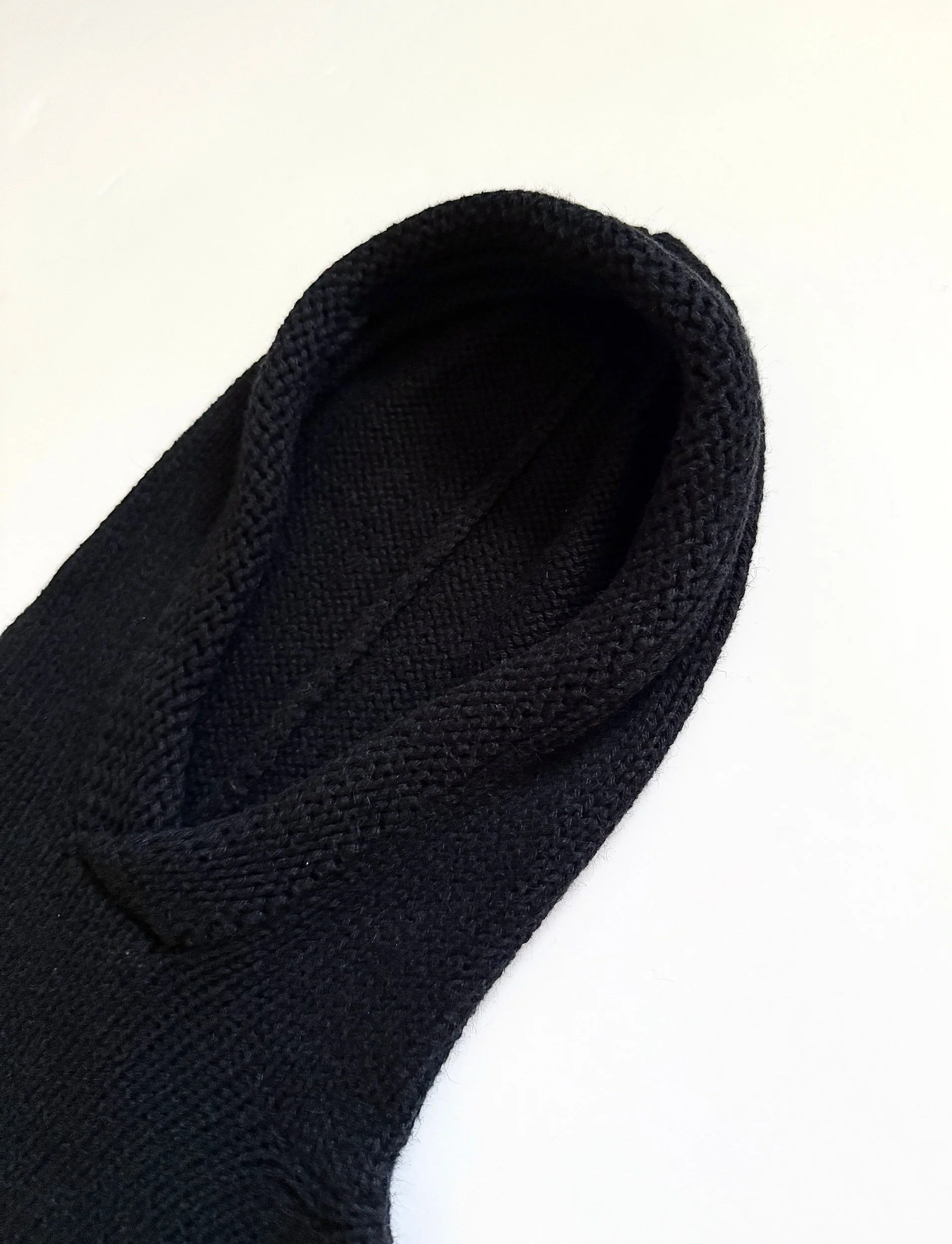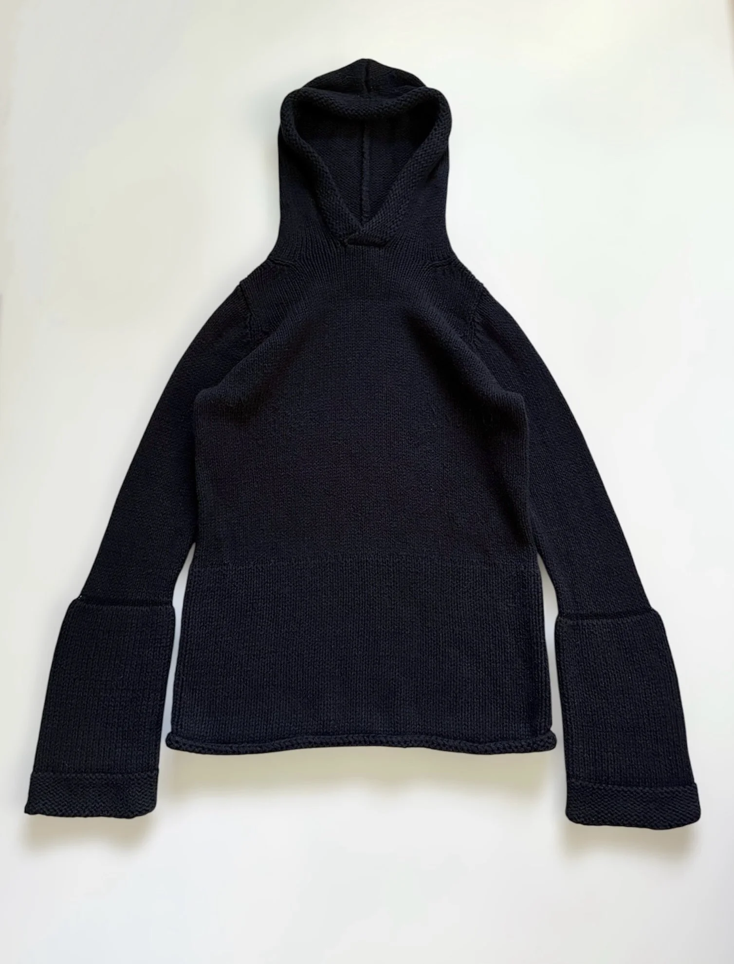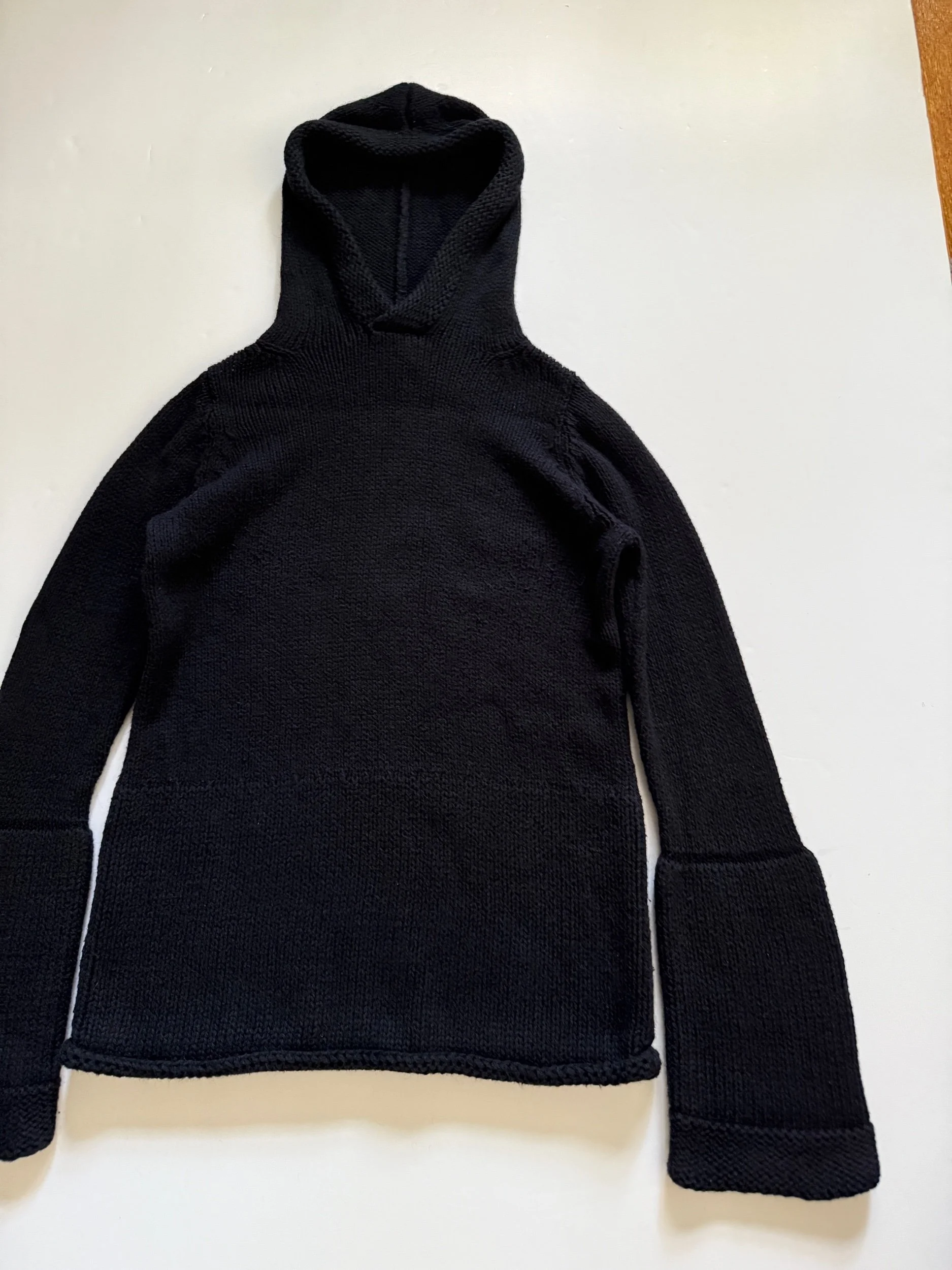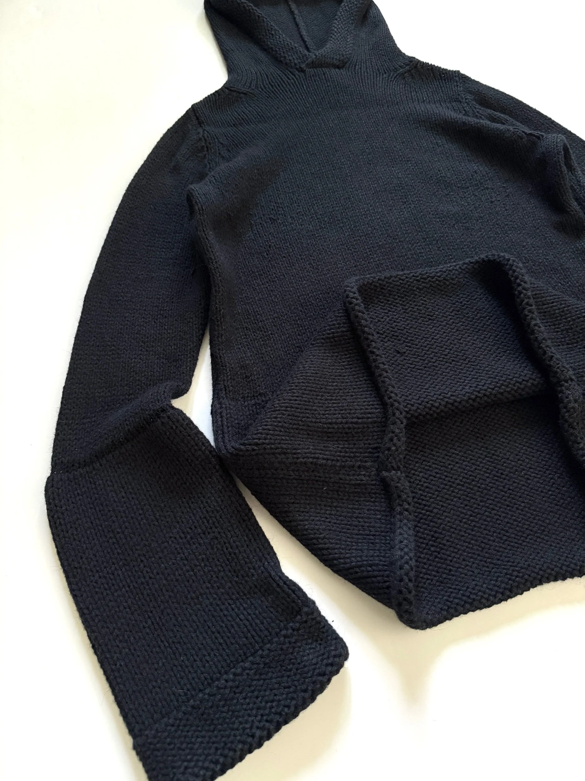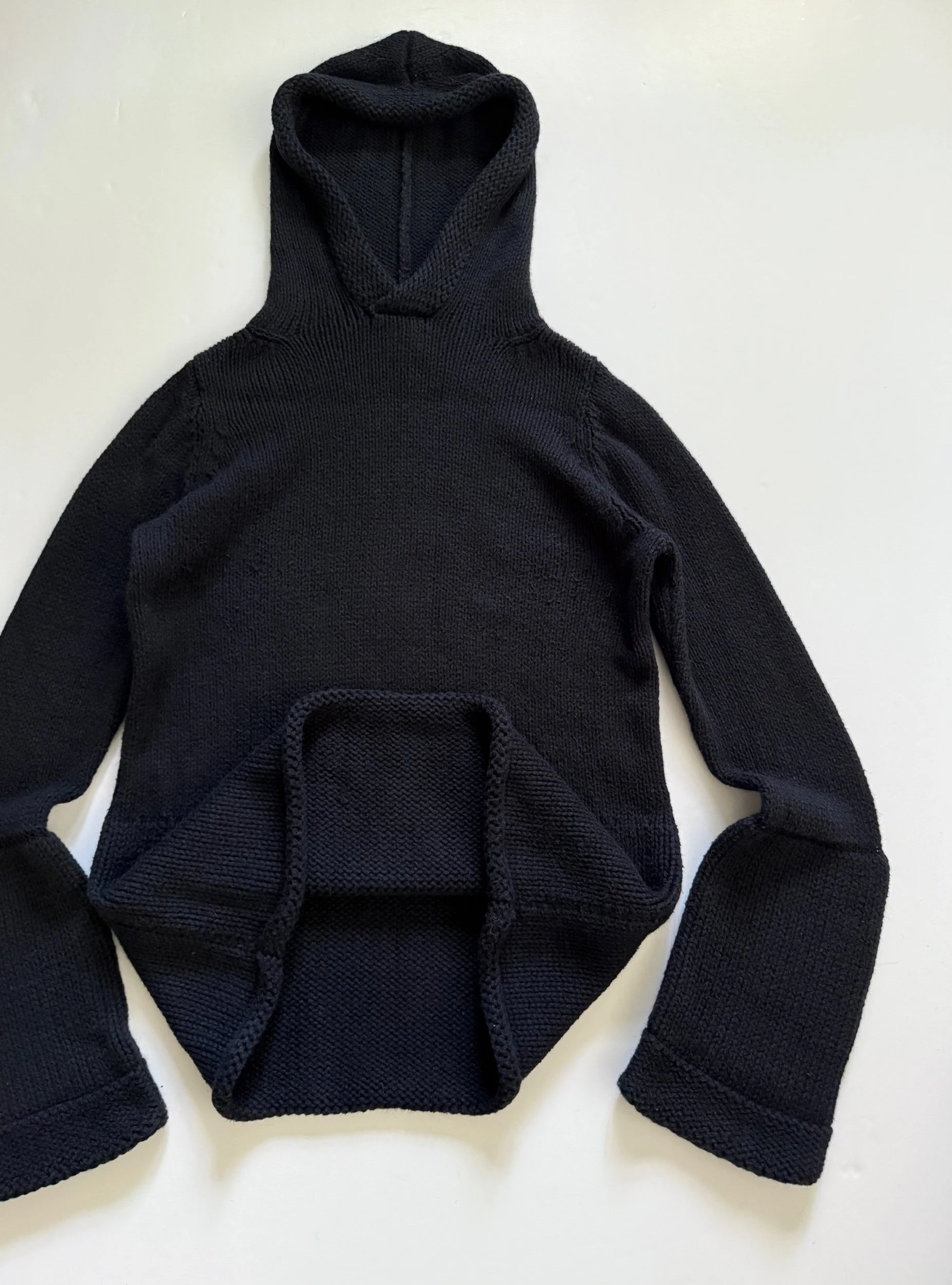 From Yohji Yamamoto Y’s line is a flattering black hooded longsleeve knit with elongated dimensional sleeve. It was done in a few other dark palettes including brown, all out of a tasteful 50 cotton 50 wool blend, and was one of the best knits done that year.