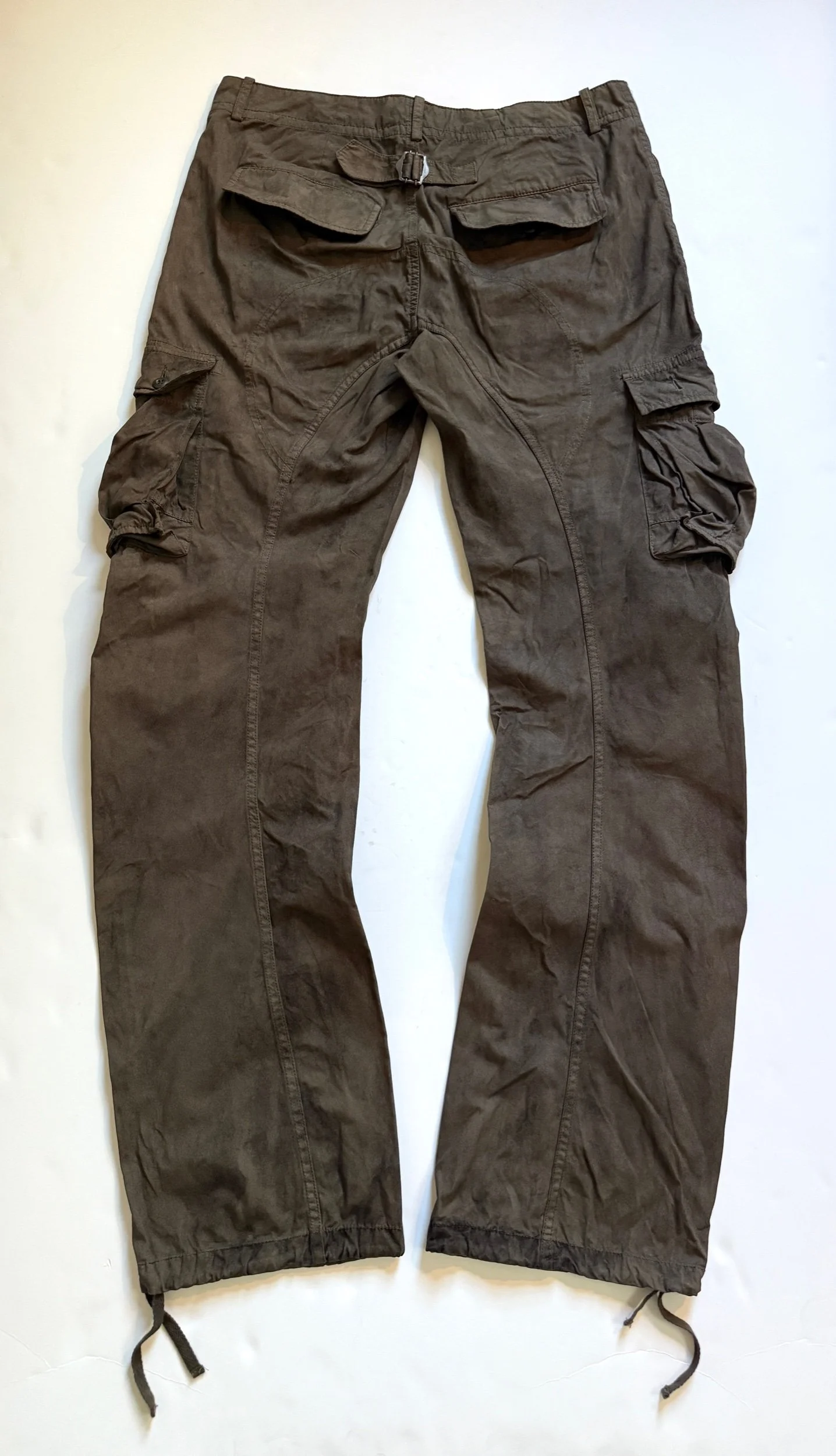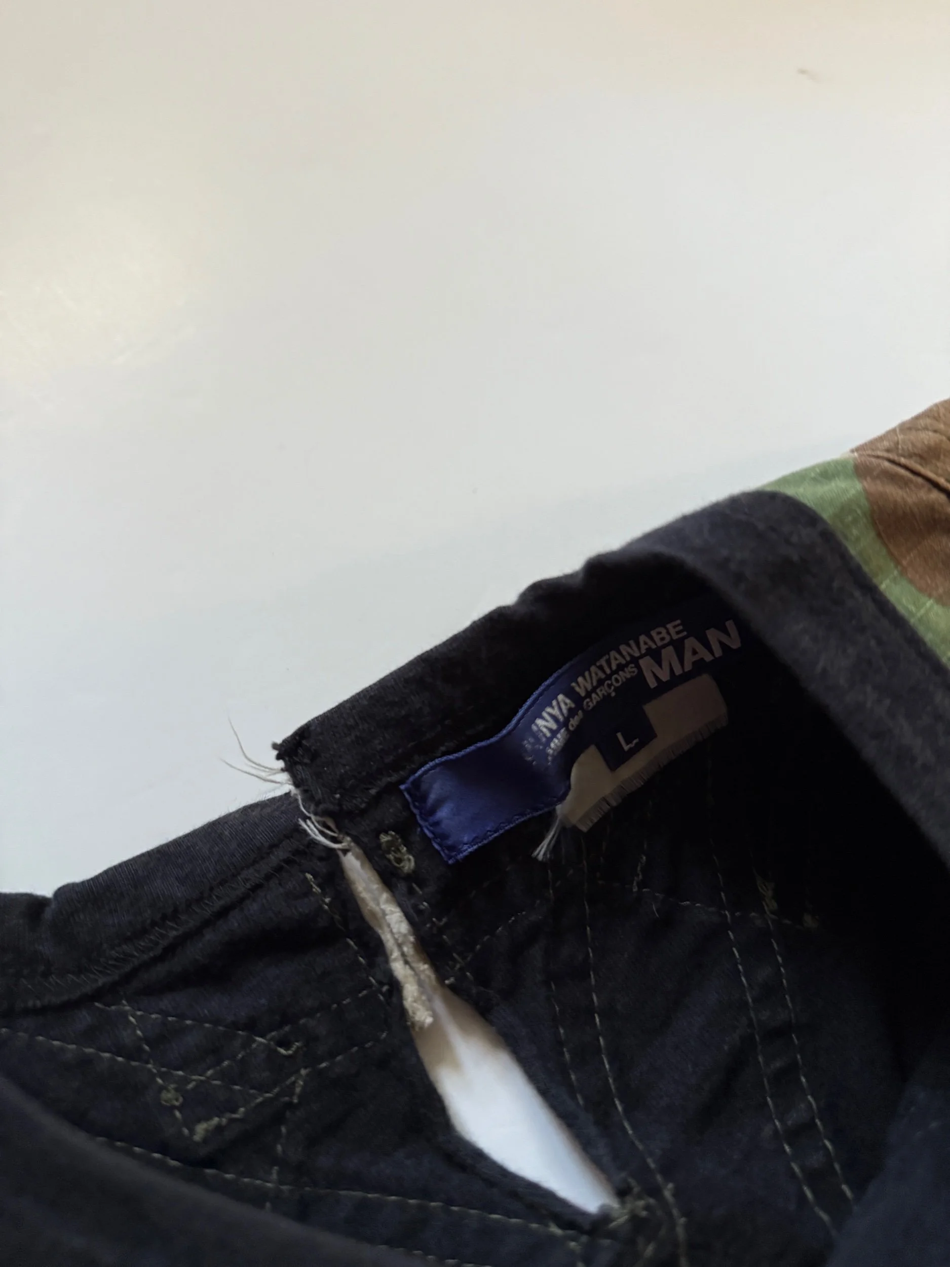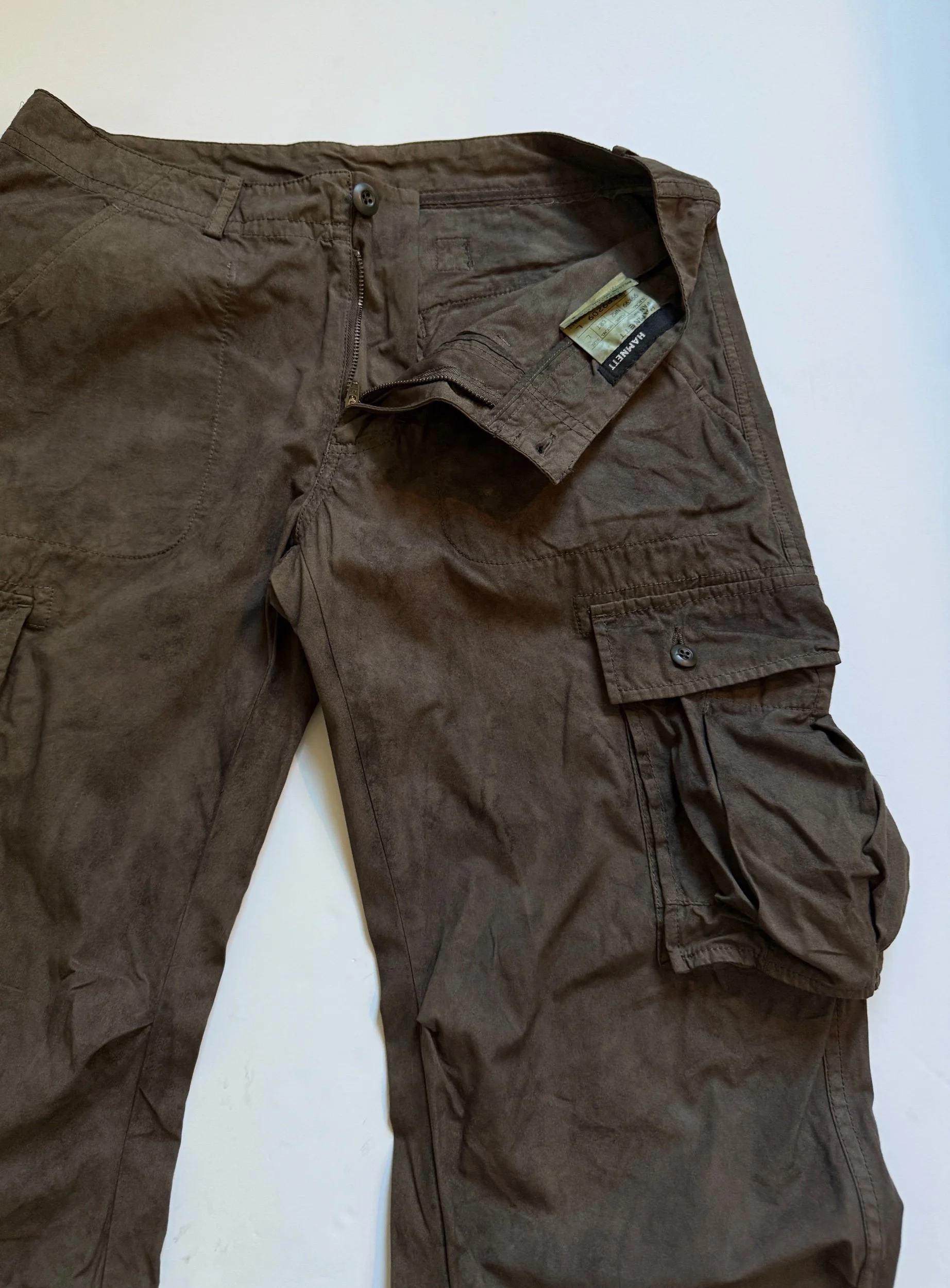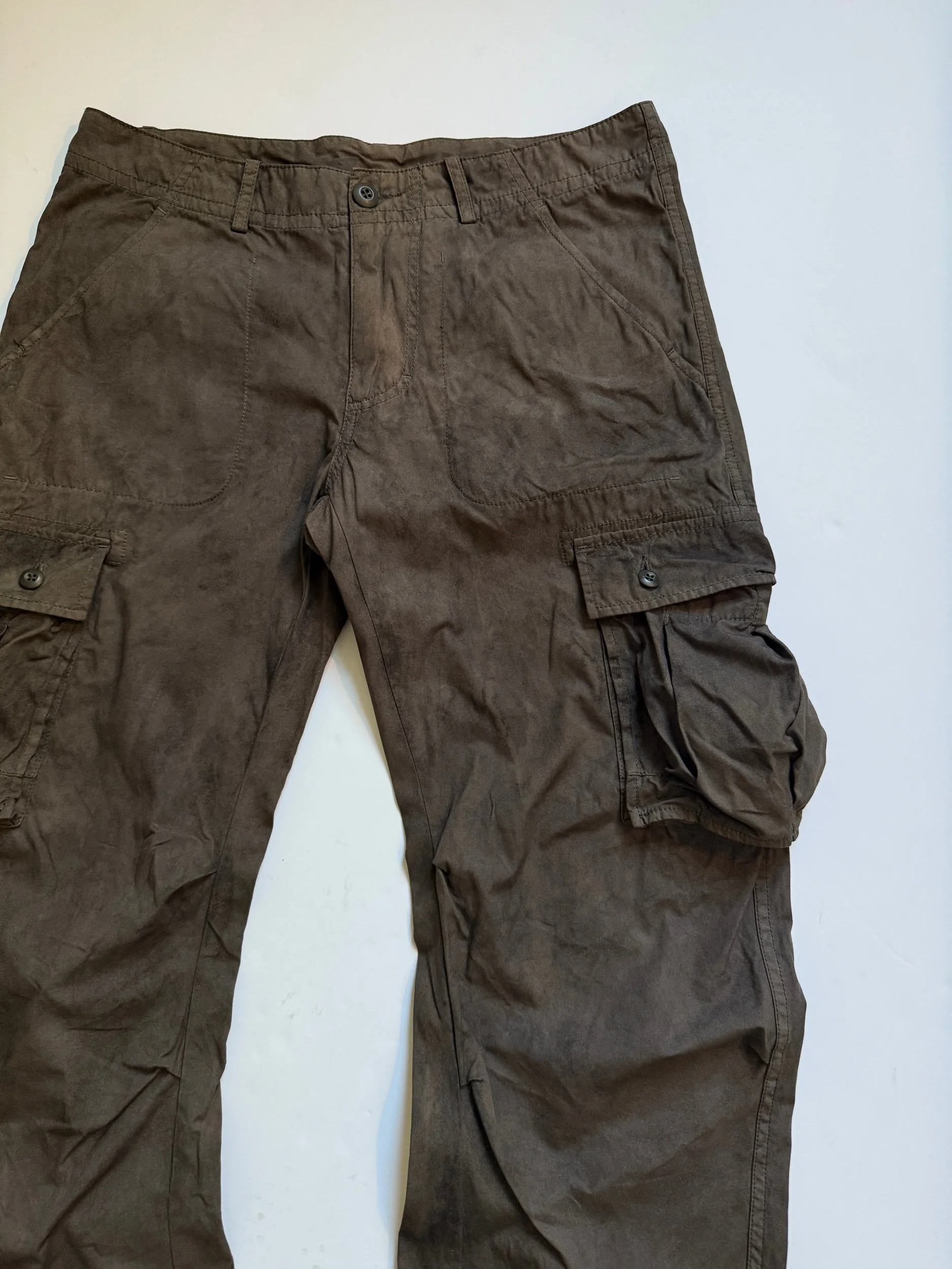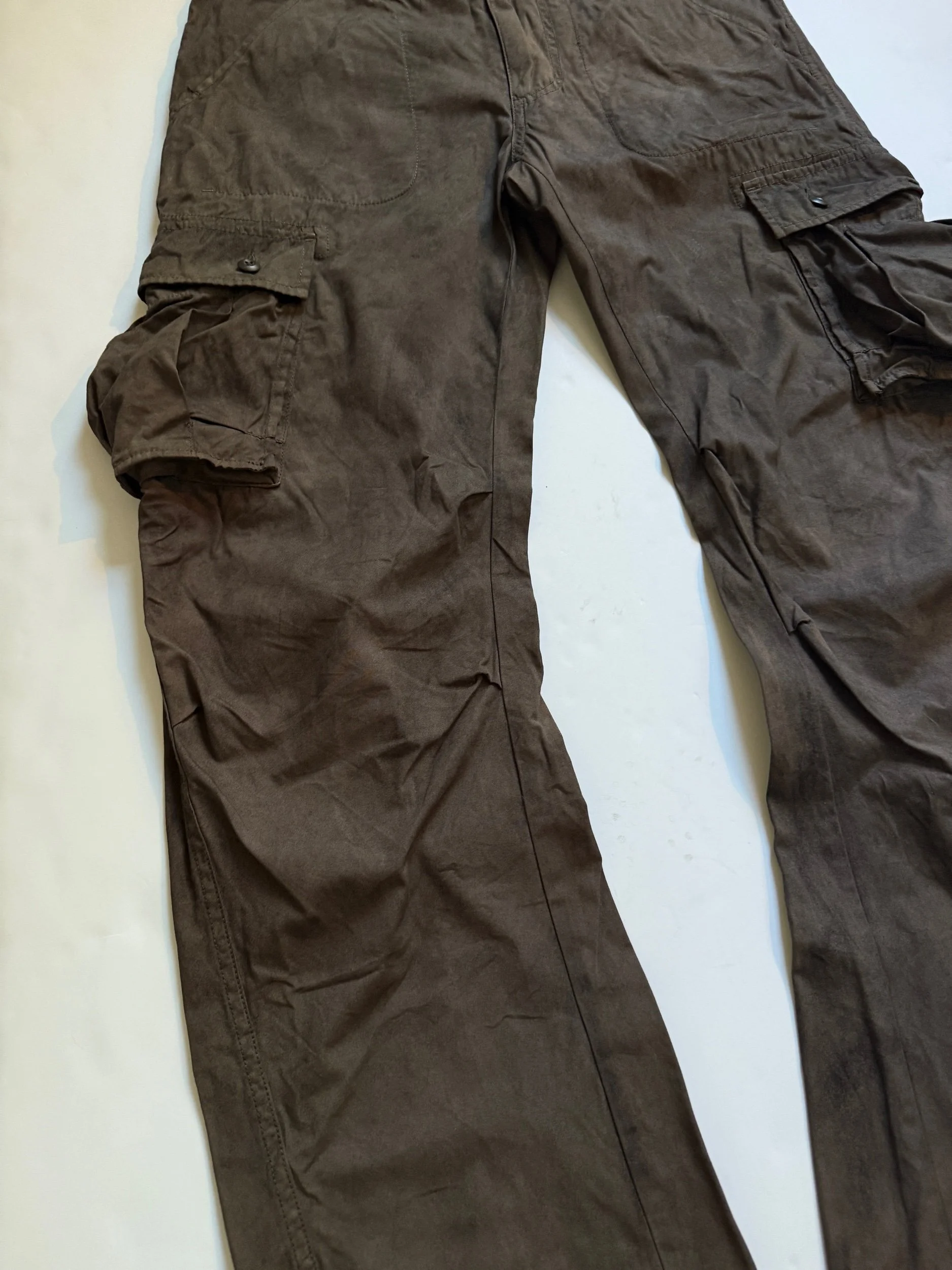 Coming from 1998 Helmut Lang is an all over blasted pair of their classic Painter denim. This pair features a variation of green, light blue, white, and black paint. Both sides are fully done with little to no chipping or distressing. Hem was pulled out on these and repaired, giving it a straight 32” inseam. A couple of the Belt loops on this pair are also re-sewn but usable all the same, great condition for age overall. Tagged a size 30, They fit a 30-31” waist