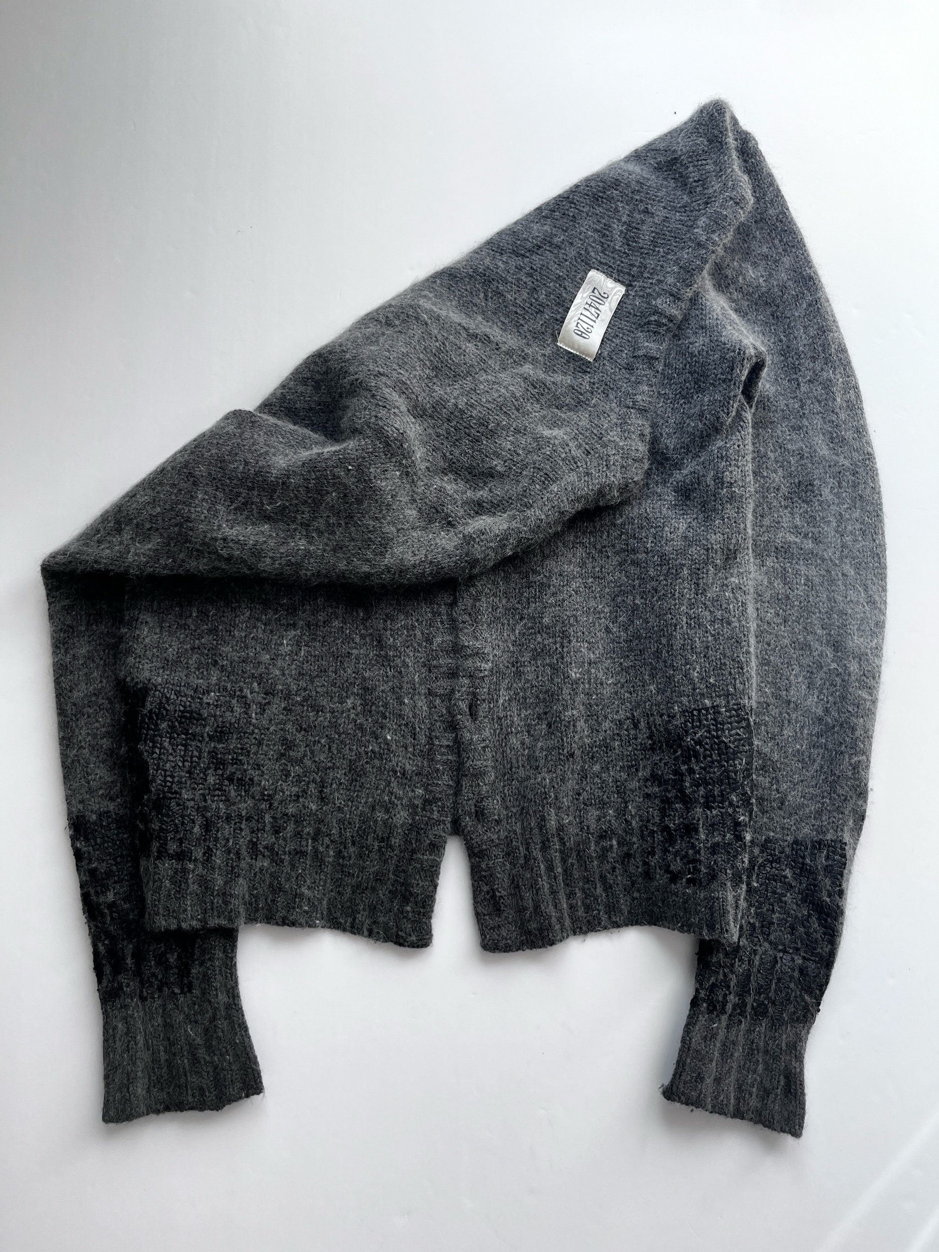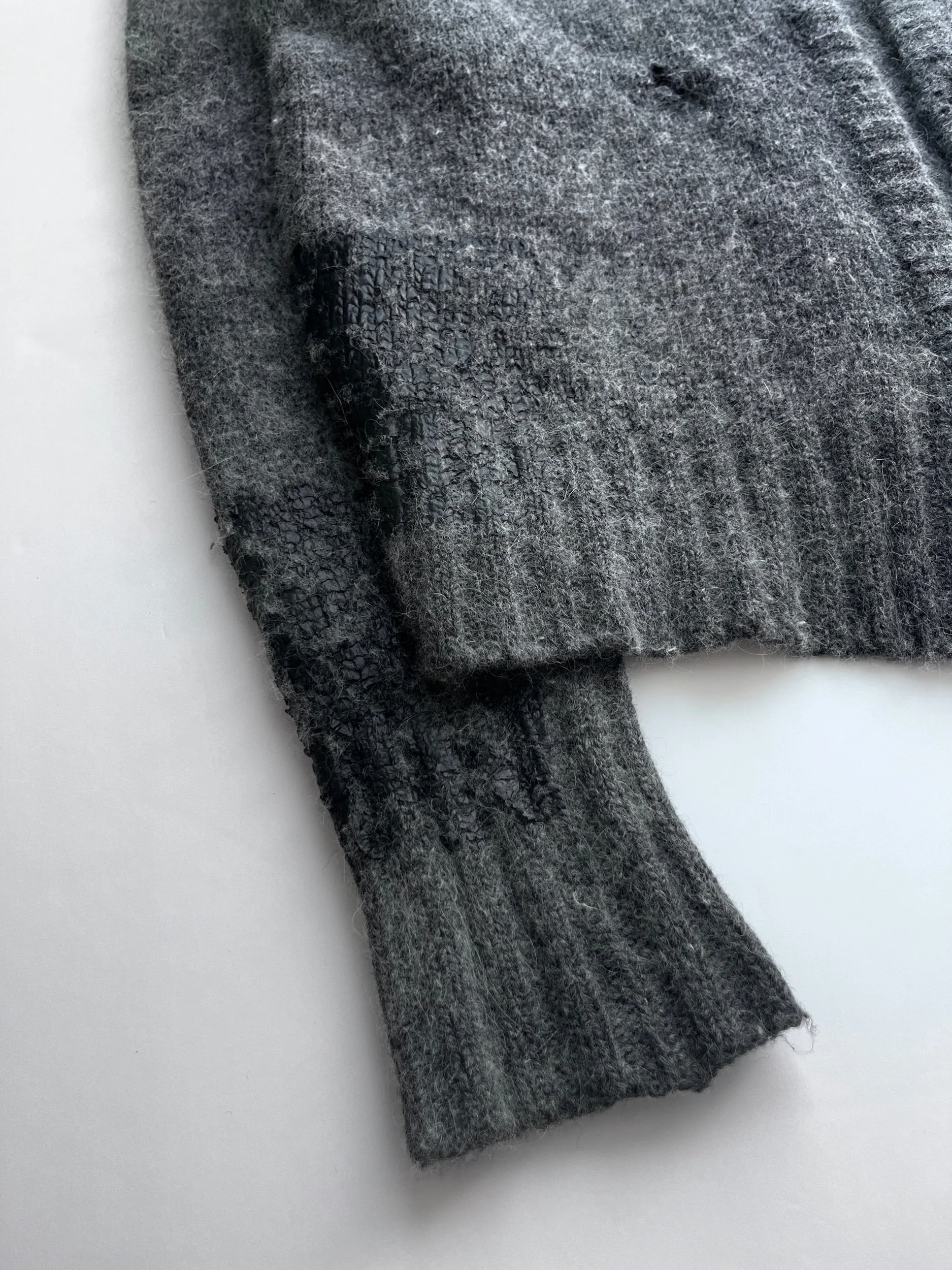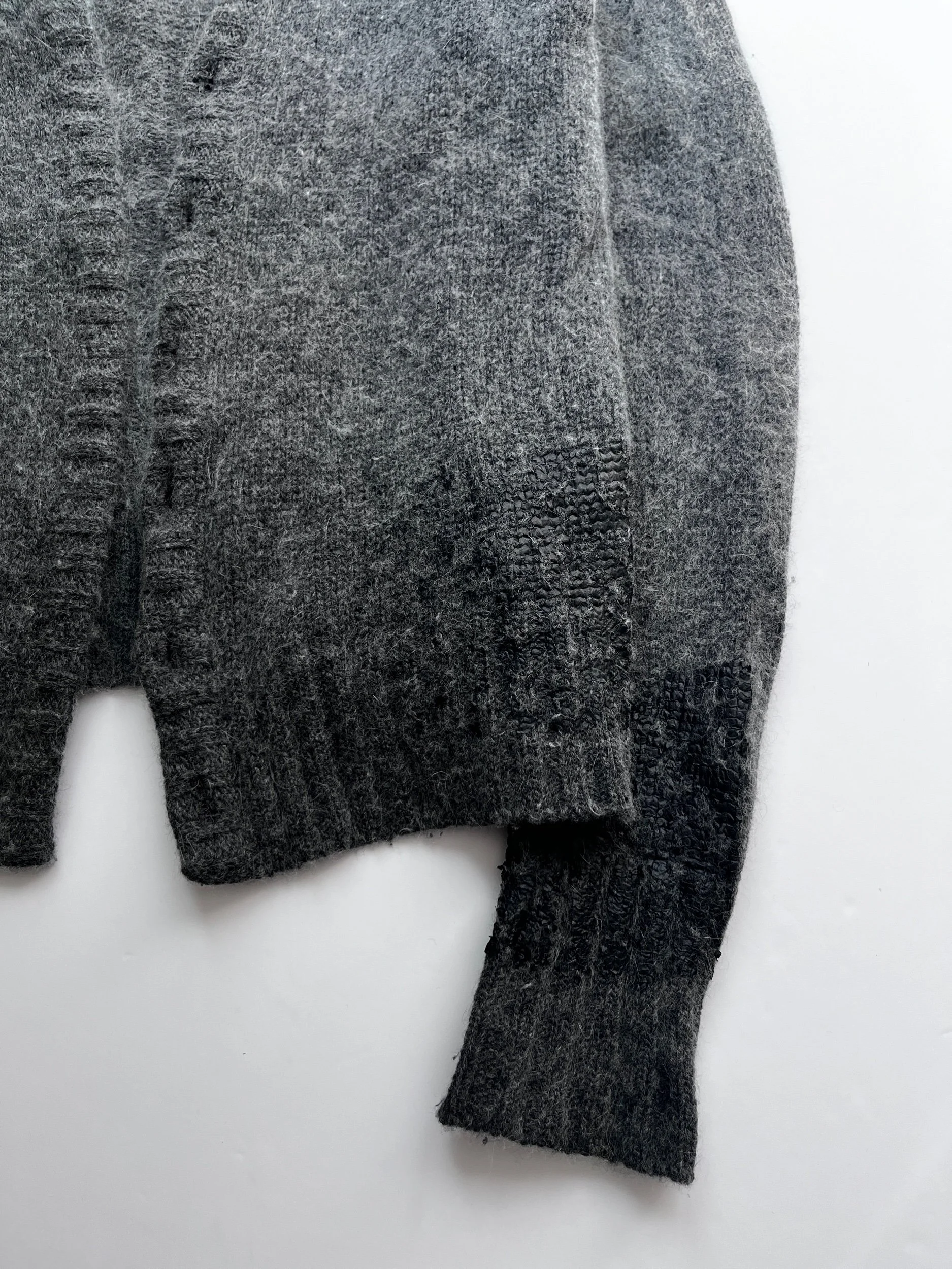 Formally founded by Masahiro Nakagawa, the brand kick started with attributes and unique services that no other brand was offering yet. From custom pieces to their insane runways, they proved to stick out and are now one of the hardest labels to come by on the after market. This knit cardigan is done with a fine brushed 100% wool mohair with rubber print detailing near the sleeves and hem. flaws include two small pin holes on right side, missing original wooden buttons as they broke easy. Good condition otherwise Tagged Sz med - fits slim large